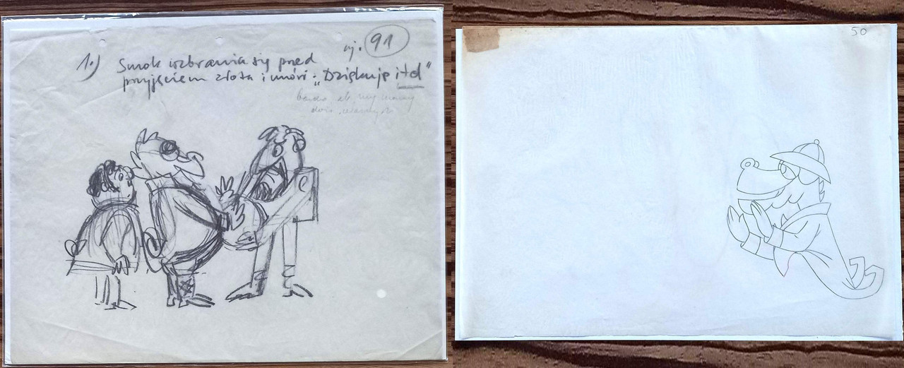 Z prawej "konturówka" Smoka Wawelskiego - to ostateczne rysunki, które trafiały do animatorów rysujących postaci farbami emulsyjnymi na celuloidach.