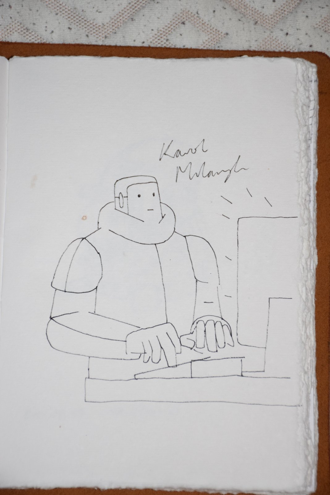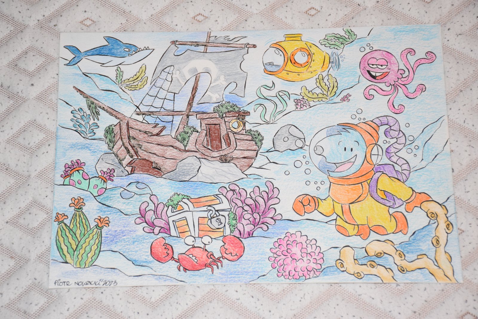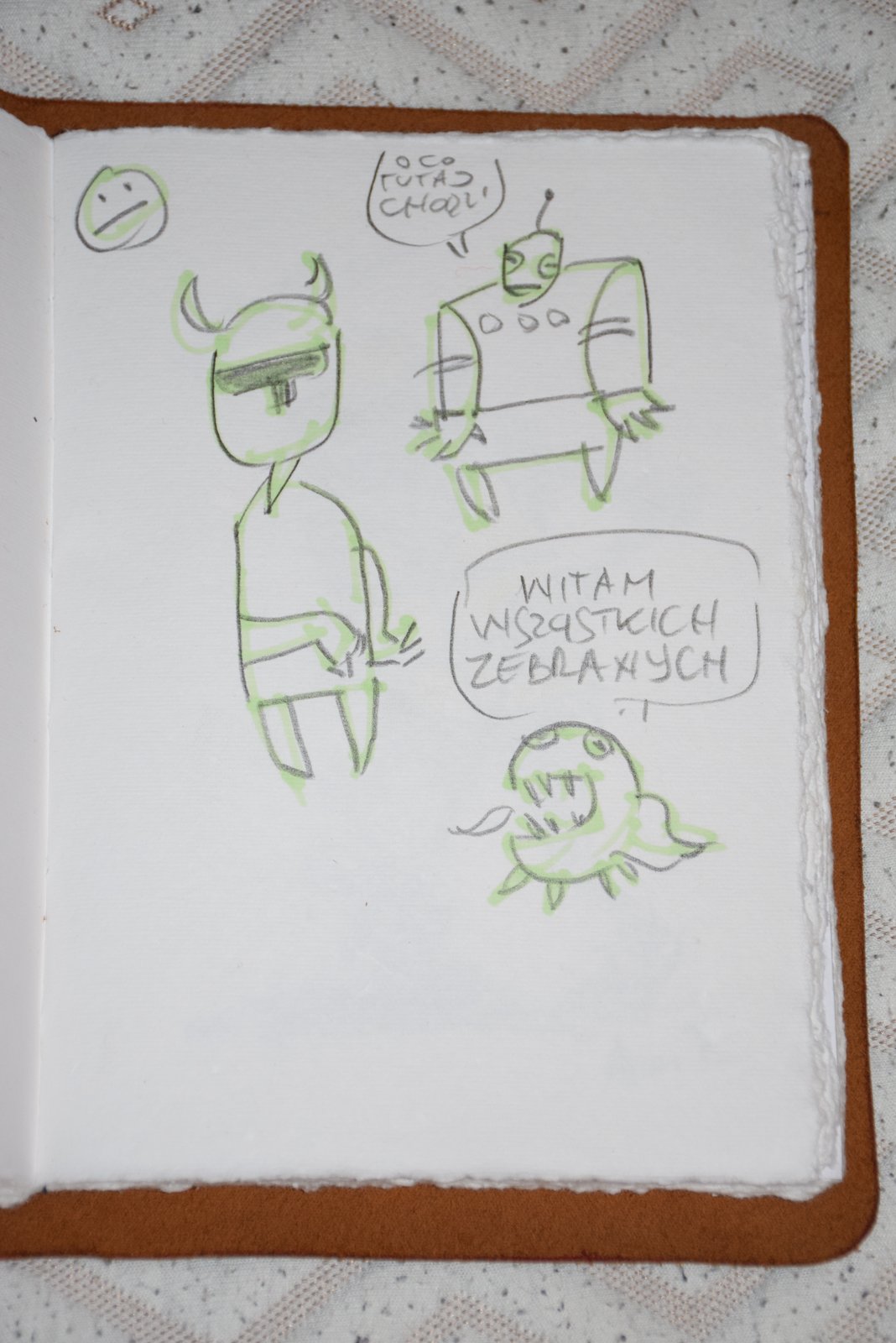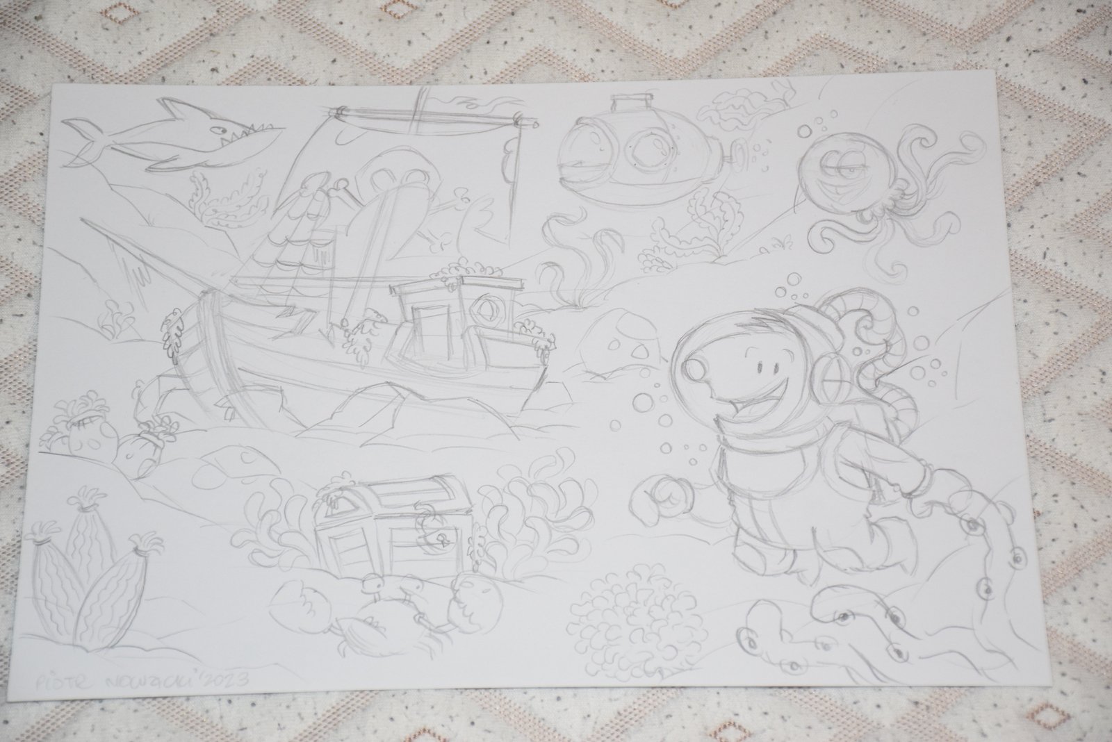 - Kolorowy podwodny Miś Zbyś od Jaszcza zamówiony wcześniej odebrany w Łodzi + szkic w ołówku (miałem pomysł na roboty, ale Piotr się wykręcał, że to nie jego tematyka, ale na NŻK już się łamał ;) ):