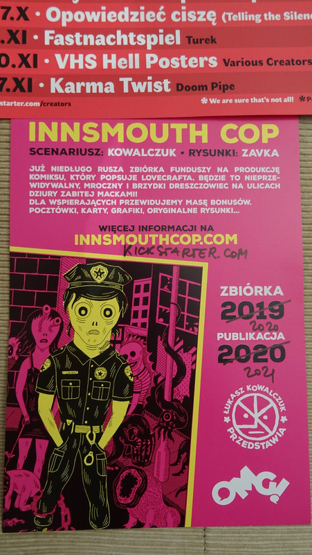 Ciekawostka - ulotka dołączona do Prison Pitów zdradza, że zbiórka na Innsmouth Cop szykowała się już rok temu (ulotka na pewno nie drukowana aktualnie z błędnymi datami, bo na drugiej stronie jest zapowiedź Małego Nemo od OMG, który już dawno wyszedł).