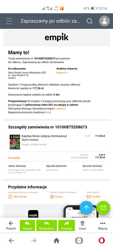 a teraz zdjęcie z nr zamówienia, miejscem odbioru od dzis, płatne przy kasie oczywiscie, macie czas do czwartku, ja odbiorę w piątek jakby chętnego nie było. Taki prezent dla forumowiczów lubiących mój wątek i mieszkających w okolicach Leszna.  :)