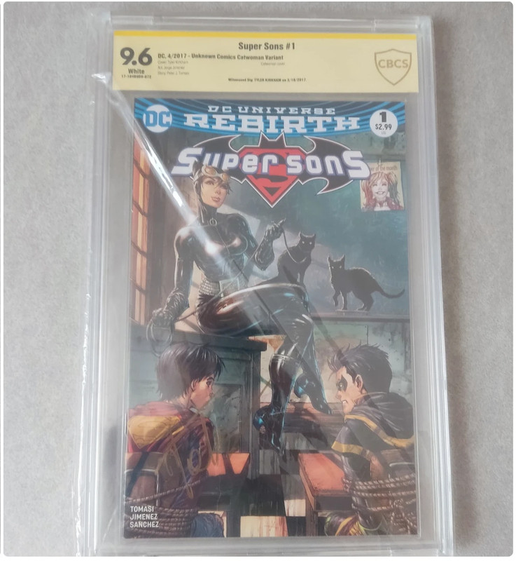 Do sprzedania komiks w slabie gradingowany przez CBCS na ocenę 9.6. Jest to pierwszy numer Super Sons z serii DC Rebirth. Wariant okładkowy Catwoman. Certyfikowany autentyczny autograf Tylera Kirkhama (autor okładki). Slab w stanie bardzo dobrym. Cena 200 zł.