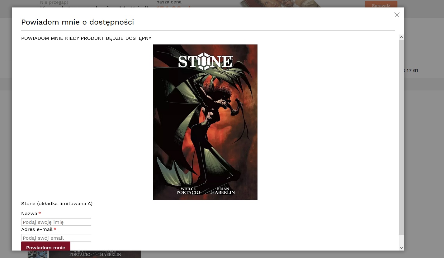 W zamówieniu mam komiks "Stone" w wersji podstawowej. W zamówieniu widnieje tylko nazwa produktu i numer katalogowy, bez ikonki okładki i linku do komiksu. Jak znam życie może to prowadzić do częstszych pomyłek, szczególnie przy wariantach lub limitkach okładkowych.