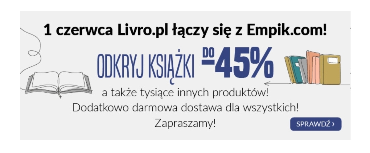 Aby zapewnić Ci najwyższą jakość obsługi, 1 czerwca Livro.pl połączy się z liderem rynkowym Empik.com - który posiada najbogatszą na polskim rynku ofertę książek w atrakcyjnych cenach, wiele unikalnych produktów dostępnych na wyłączność sieci, najświeższe premiery muzyczne i filmowe, a także tysiące ofert z różnorodnych kategorii produktowych dostępnych na Empik Marketplace takich jak: zabawki, zdrowie i uroda, dom i ogród, sport, elektronika i wielu innych.
