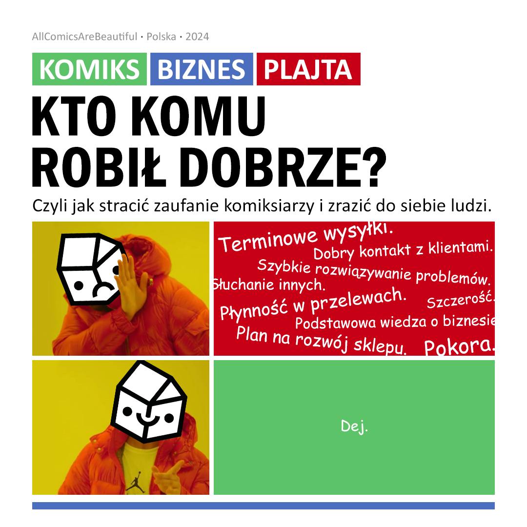 Po długich miesiącach marazmu, wyprzedaży prywatnych rzeczy i długotrwałym braku ognia w działaniach jednoosobowej działalności gospodarczej, czyli sklepie Róbmy Dobrze, stało się to, co było nieuniknione. W amerykański Dzień Niepodległości Michał Nowakowski, prowadzący RD, ogłosił upadek. Istniejący od 2021 roku przybytek miał całkiem solidny początek, ale im dłużej trwał jego żywot, tym więcej pojawiało się problemów, związanych nie tylko z zewnętrznymi czynnikami, jak wyższe podatki, niskie marże, sprawna konkurencja itp. To że małe biznesy mają w naszym kraju mocno pod górkę, to historia znana i raczej nikt nie będzie z tym dyskutował (szczególnie w ostatnich latach). Natomiast pomimo tych zewnętrznych trudności, sposób prowadzenia biznesu przez Michała dolewał oliwy do ognia i komplikował mu biznesową sytuację. Właśnie tym działaniom chciałbym głównie poświęcić ten wpis - trochę jako podsumowanie żywota tego interesującego pod wieloma względami komiksowego bytu, a trochę jako przestroga/nauka dla już istniejących (i w przyszłości powstających) biznesów, nastawionych na mniejszą lub większą sprzedaż komiksów. A przede wszystkim jako zupełnie inne spojrzenie na powody zamknięcia sklepu, niż te które podaje Nowakowski i które w ten sposób zwalniają go zupełnie z odpowiedzialności za plajtę.