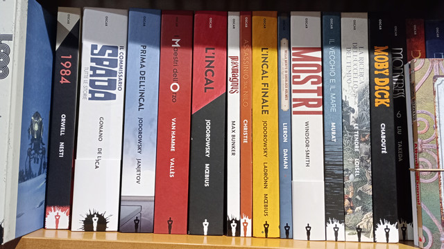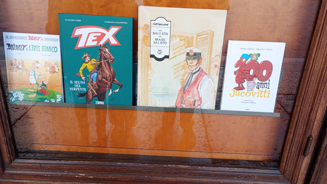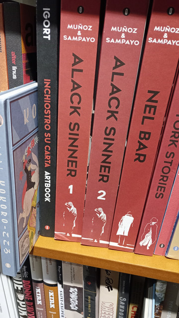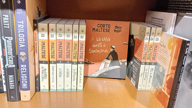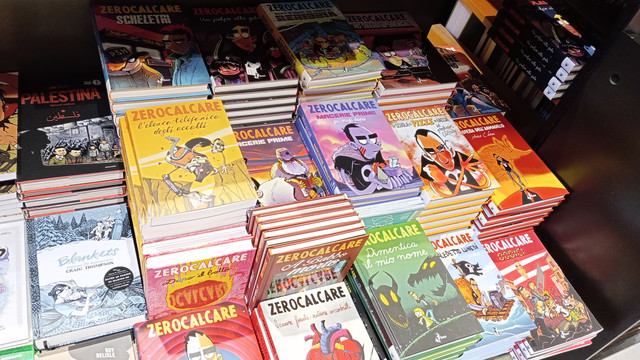 Parę fotek z księgarni napotkanych w czasie spaceru po Bolonii. Tych księgarni jest całkiem sporo, często piętrowe. Jedna księgarnia to takie combo ze sklepem spożywczym, kawiarnią i restauracją. W każdej z nich są regały z komiksami. Bardzo dużo Corto Maltese i to w różnych rozmiarach. Od ogromnych albumów przez A4 do kieszonkowych rozmiarów (te ostatnie 12-14 EUR). Zerocalcare w ogromnych ilościach na każdym kroku. I jakaś seria klasyków jak Incal, władcy chmielu w wydaniach trochę mniejszych niż A4, na offsecie, miękkich okładkach za 30-40 EUR. Ceny okładkowe, a nie wiem jak to wychodzi na kasie. Włoskiego nie znam, więc nawet nie rozważałem zakupów. Są też i sh, w kioskach jakieś albumy Manary da się znaleźć.