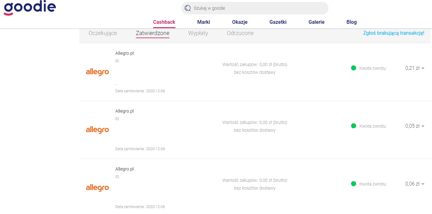 Goodie mi ostatnio losowo odrzuca cachbacki, nawet te zaakceptowane od dłuższego czasu. Nie mam za bardzo do nich siły, liczę, że jeszcze coś zaakceptują, żeby wypłacić te zawrotne 21 złotych i o nich zapomnieć. Na razie testuję LetyShops, zobaczymy jak to z nimi będzie - mają niższy cashback, ale może chociaż będą go normalnie przyznawać.