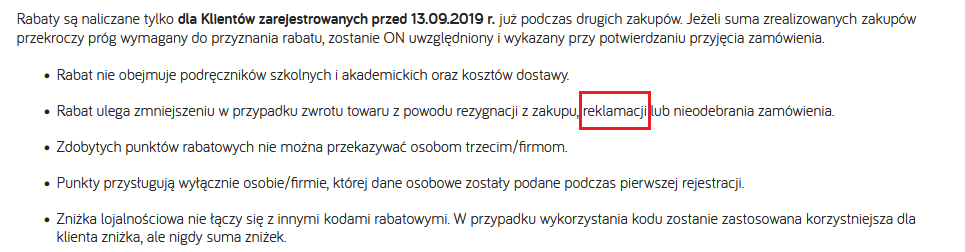 Nie drążyłem dalej, ale z czasem po jakimś roku czy coś dodali zapis do regulaminu, że rabat ulega zmniejszeniu także w przypadku reklamacji.