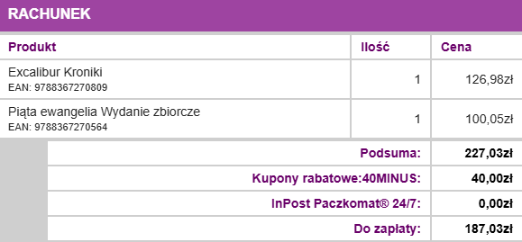 W podsumowaniu zamówienia z TK jest jeszcze ujęta wartość bez kodu z InpostPay. Natomiast finalnie zapłaciłem 157,03zł (około -46,5% okładkowych) za: